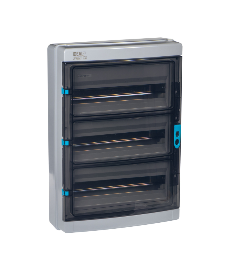 Rozdzielnica serii KDB-IP65-S54T Obudowy do zastosowań specjalnych - rodzina KDB-IP65 wyróżnia się zwiększoną odpornością na warunki atmosferyczne. Wykonane z materiału odpornego na działanie promieniowania UV, spełniają warunki odporności na wnikanie ciał stałych i wody w stopniu IP65, wytrzymałość mechaniczna na poziomie wymagań stopnia IK10. W zestawie akcesoria montażowe wraz z elementami uszczelniającymi połączenia, szyny łączeniowe, naklejki opisowe oraz zaślepki modułowe....