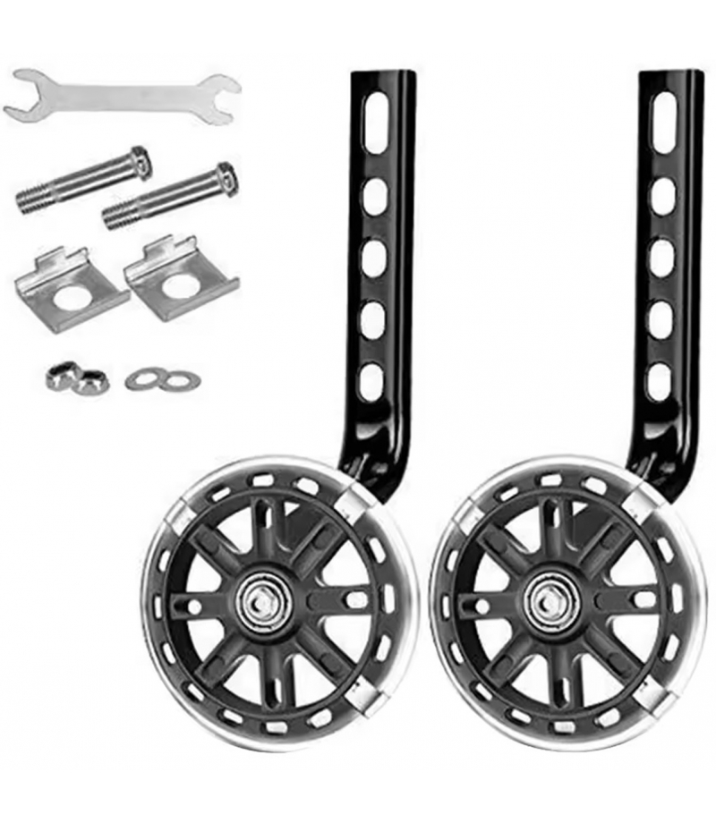 Zestaw dwóch kółek bocznych do rowerka dziecięcego. Zapewniają stabilną i bezpieczną jazdę na dwóch kółkach. Ułatwiają naukę jazdy na rowerze, bez ryzyka wywrócenia się. Trwała konstrukcja z aluminiowym uchwytem mocowanym do tylnego koła. Kółka wykonane z gumowanego materiału, który zwiększa wygodę użytkowania. Dodatkowe podświetlenie LED zwiększa atrakcyjność kółek.