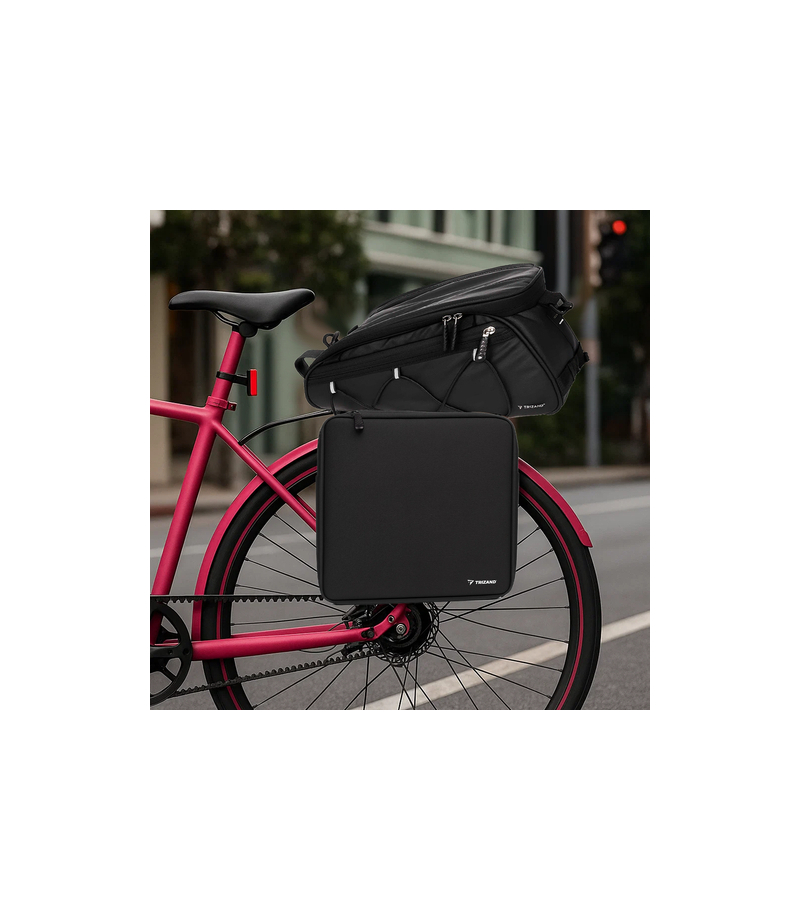 - spójna całość, zero luzów - wystarczy użyć rzepów i karabińczyków, by stabilnie przymocować cały zestaw do bagażnika rowerowego, tworząc jedną spójną i bezpieczną konstrukcję