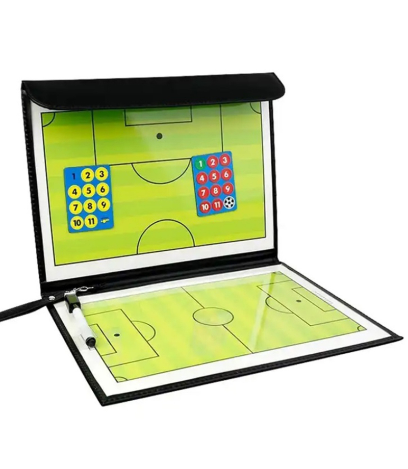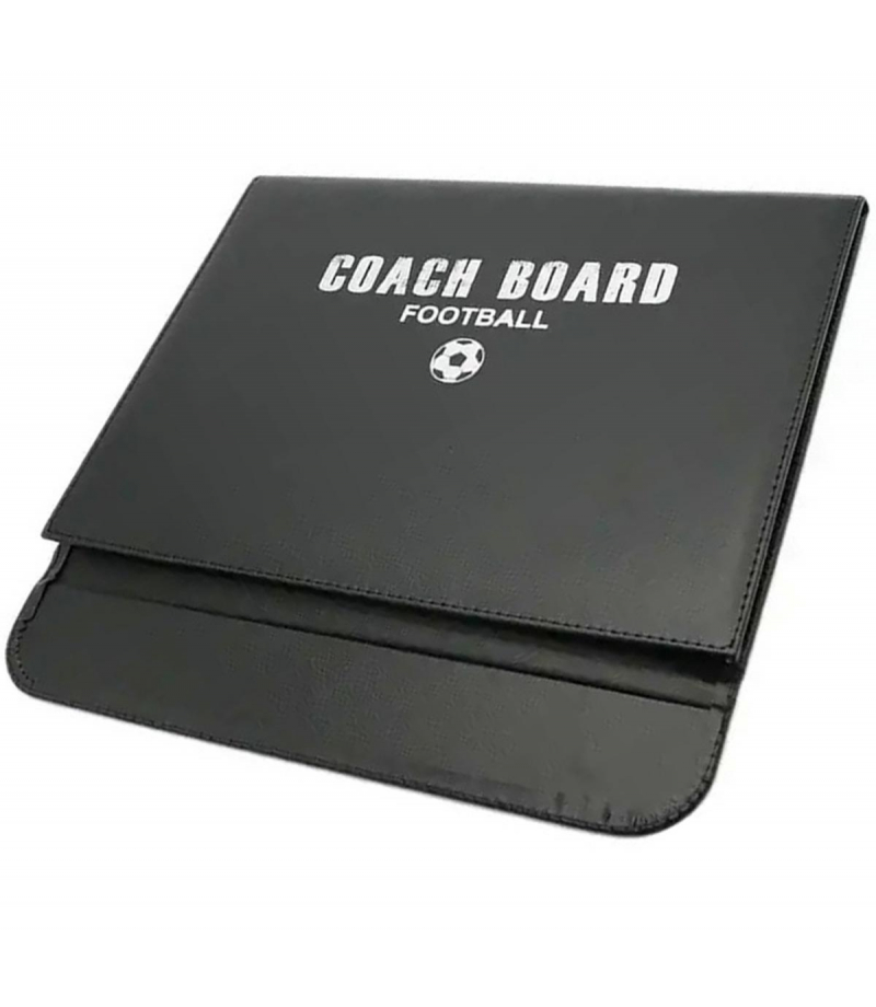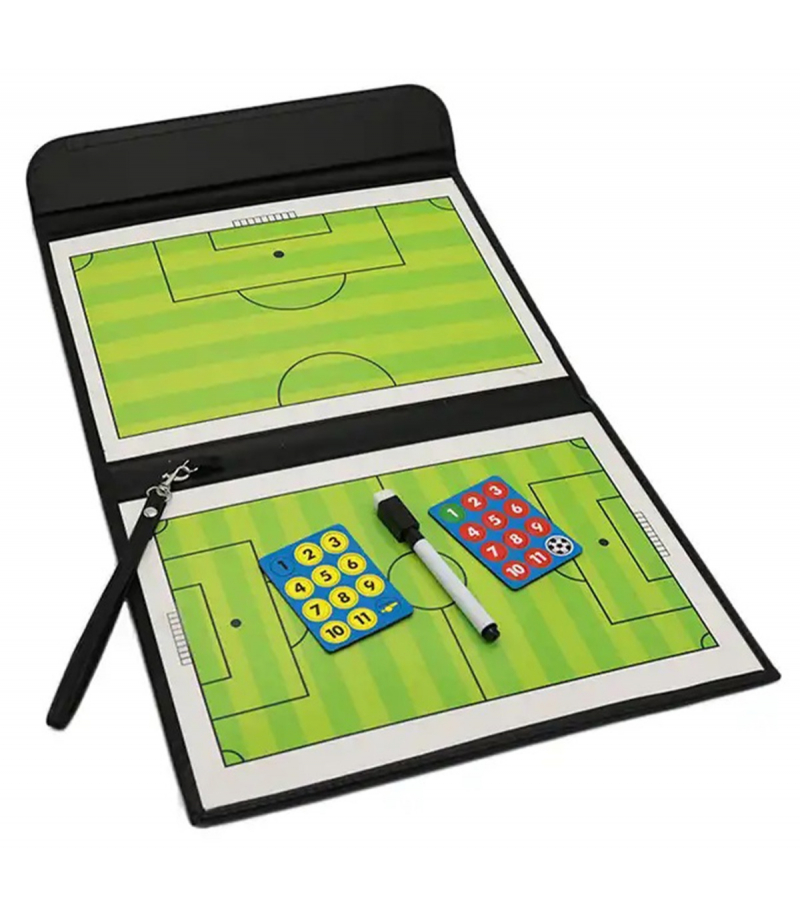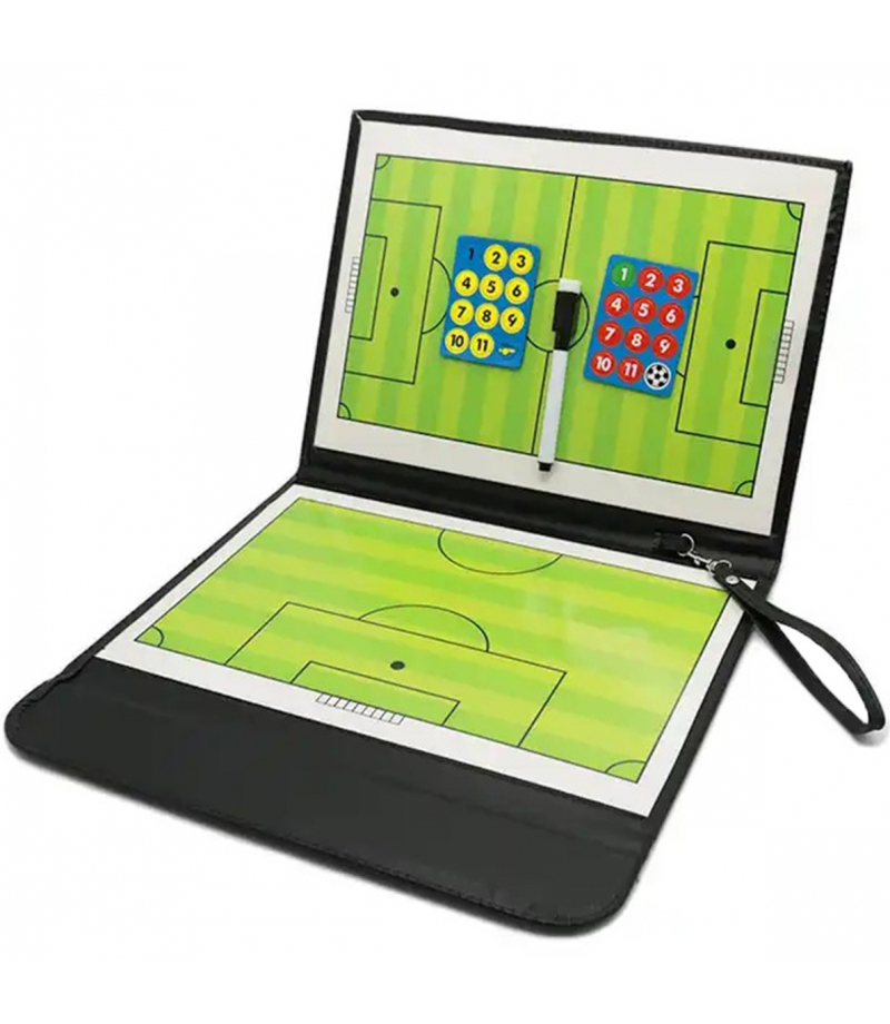 Tablica taktyczna służąca do prowadzenia treningów w piłkę nożną. Wygodna forma w kształcie zamykanego na rzep folderu z ekoskóry. Wyposażona w dwie magnetyczne tablice przedstawiające pole gry. W komplecie znajdują się również ścieralny pisak oraz 24 magnesy. Tablica została wykonana z wodoodpornego materiału, co pozwala na prowadzenie treningów nawet w trudnych warunkach atmosferycznych. Dodatkowa zawieszka umożliwiają odwieszenie folderu na haczyk.