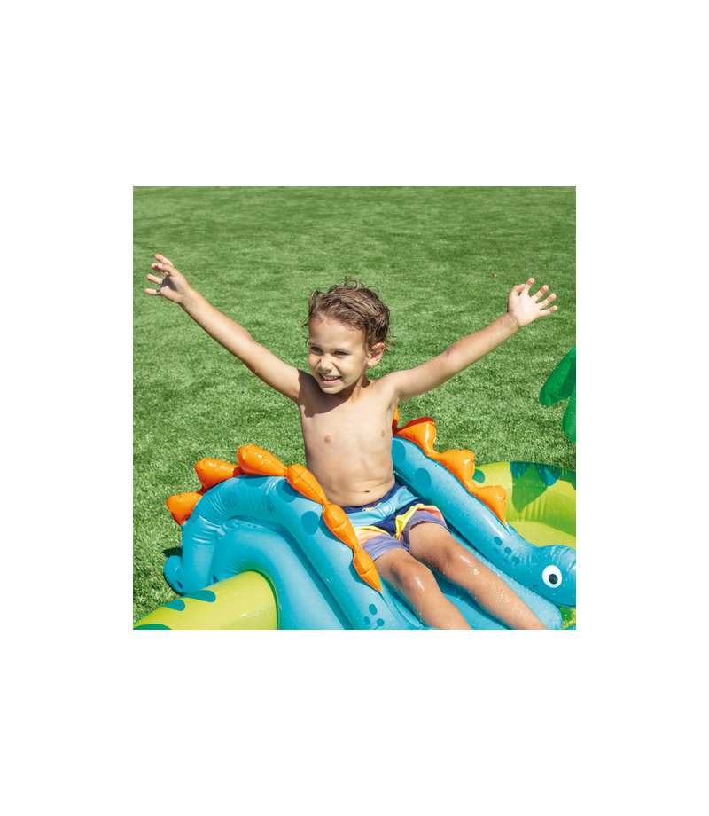 Wodny plac zabaw dla dzieci Mały Dino 191 x 152 x 58 cm zjeżdżalnia zraszacz Intex 57166 Szukasz pomysłu na letnią zabawę bez wyjazdów i bez nudy po 5 minutach Wodny plac zabaw Intex Mały Dino zamienia ogród w mini aquapark - ze zjeżdżalnią, fontanną i bezpiecznym, płytkim basenikiem dla maluchów od 2 lat. Kluczowe cechy wodnego parku rozrywki INTEX dmuchana zjeżdżalnia z miękką matą do lądowania - bezpieczniejsza zabawa i mniej obaw o upadki zraszacz w palmie po...