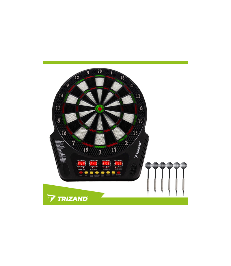 Tarcza do darta elektroniczna Trizand zestaw do gry w rzutki z 4 wyświetlaczami LED - dla 1-16 graczy - 6 rzutek z aluminiowymi shaftami i 24 zapasowe groty - regulacja głośności 8 poziomów Szukasz sposobu na wspólną zabawę, która wciągnie dorosłych i dzieciElektroniczna tarcza TRIZAND to połączenie rywalizacji, precyzji i radości – bezpieczna, nowoczesna i gotowa do gry od razu po rozpakowaniu. Dzięki automatycznemu zliczaniu punktów, dźwiękowym efektom i aż 27 grom z 243 trybami...