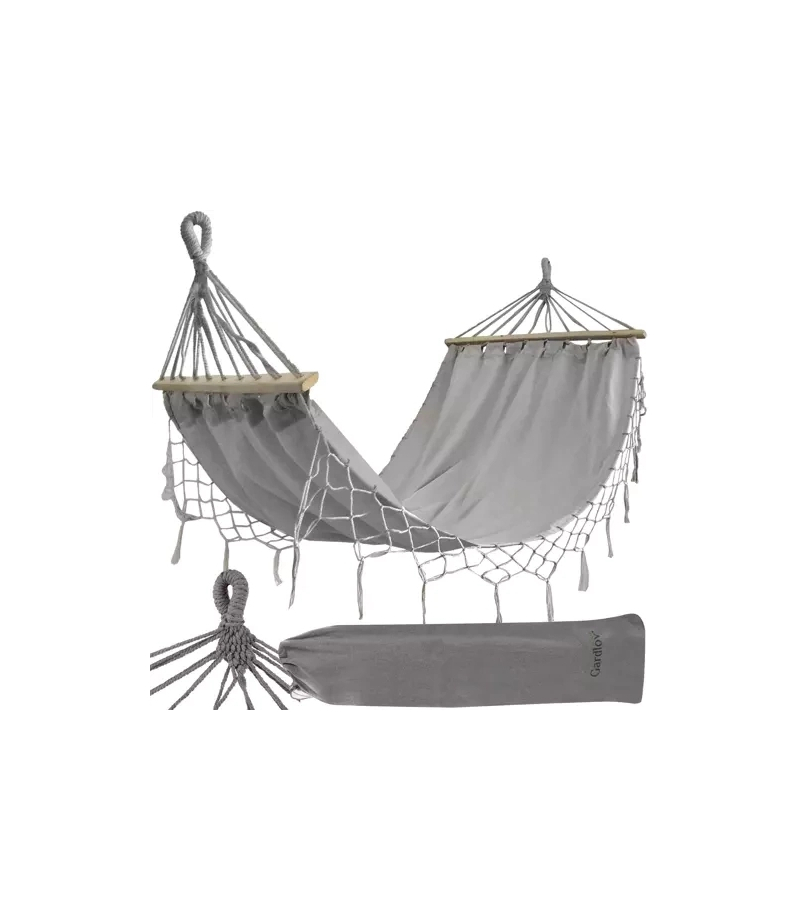 SPECYFIKACJA - kolor: szary; materiał: bawełna, poliester; maksymalne obciążenie: 200 kg; długość stelaża drewnianego: 80 cm; wymiary materiału (dł/szer): 200 x 100 cm; długość całości: 270 cm; waga: 1,4 kg; waga w opakowaniu: 1,6 kg.