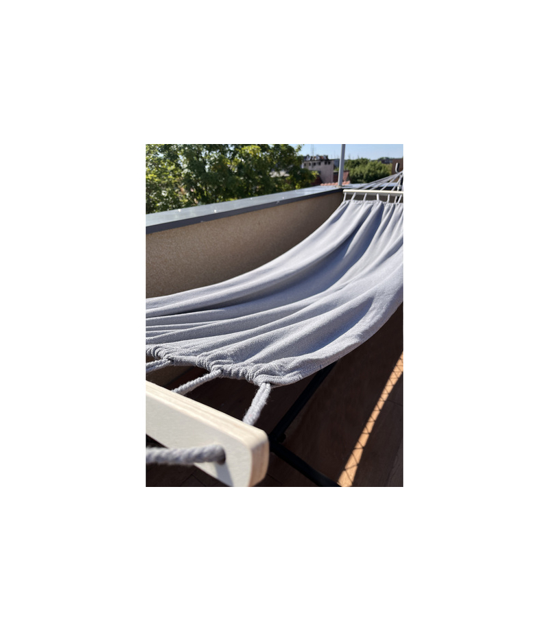mocny materiał - hamak ze staelażem został wykonany z wysokiej jakości mieszanki bawełny (65%) i poliestru (35%), dzięki czemu oddycha, jest odporny na rozciąganie i nie przeciera się łatwo