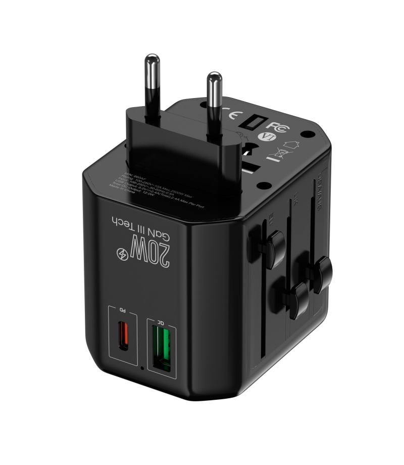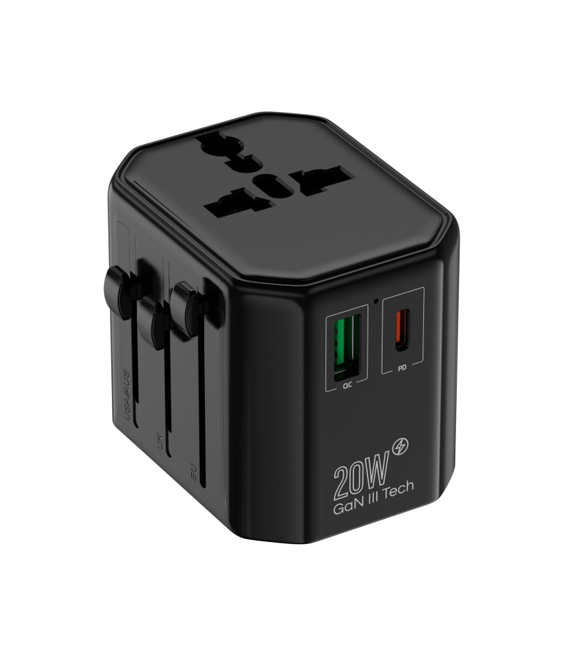 Uniwersalny adapter sieciowy obsługujący wtyczki EU, UK, US i AU zapewnia wygodne ładowanie urządzeń w podróży po całym świecie. Adapter oferuje port USB-C z szybkim ładowaniem PD do 20W (5V/3A, 9V/2,22A, 12V/1,67A) oraz port USB-A z mocą do 18W (5V/3A, 9V/2A, 12V/1,5A). Przy jednoczesnym korzystaniu z USB-C i USB-A łączna moc wyjściowa wynosi 20W (5V/3A), co pozwala efektywnie ładować smartfony i inne małe urządzenia mobilne. Kompaktowe wymiary 65x55x55mm ułatwiają transport w bagażu podręcznym.