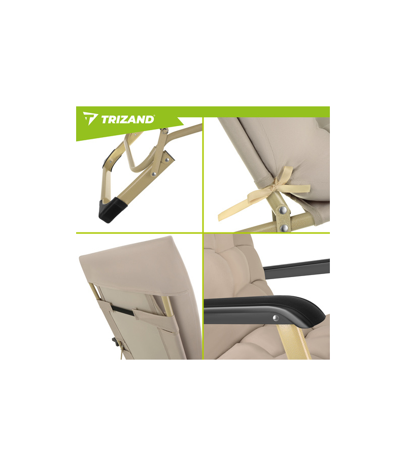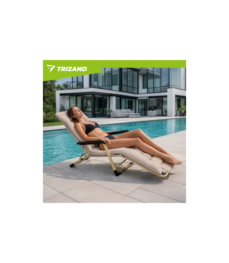 Leżak ogrodowy składany TRIZAND beżowy z grubą poduszką + zagłówek Chcesz wygodnie odpocząć w ogrodzie, na tarasie albo na plaży - bez kombinowania z ciężkimi meblami i niewygodnymi leżankami Składany leżak TRIZAND 3w1 daje Ci komfortową pozycję siedzącą, półleżącą lub leżącą, a do tego ma grubą poduszkę i zagłówek w zestawie . Najważniejsze zalety leżaka 3w1 TRIZAND 3 pozycje regulacji - dopasujesz ułożenie do czytania, opalania i drzemki funkcja 3w1: fotel, leżak i leżanka - jeden model do wielu zastosowań, oszczędzasz miejsce 3-stopniowa regulacja podnóżka - podpierasz nogi dokładnie tak, jak lubisz, odciążasz kolana i plecy, a odpoczynek staje się naprawdę “na luzie” tkanina Oxford 600D - odporność na przetarcia i proste czyszczenie na co dzień gruba poduszka z 1,2 kg wypełnienia - miękkie podparcie na całej długości, wyższy komfort odpoczynku zdejmowana poduszka i zagłówek - łatwo ustawisz wygodę pod siebie i szybciej zadbasz o czystość poduszka z możliwością prania - wypierzesz ją w pralce w 30°C na delikatnym cyklu, żeby zawsze była czysta i świeża antypoślizgowe nóżki - stabilniej stoi na trawie, płytkach i piasku składana konstrukcja - łatwy transport i przechowywanie w schowku lub bagażniku... Więcej szczegółów