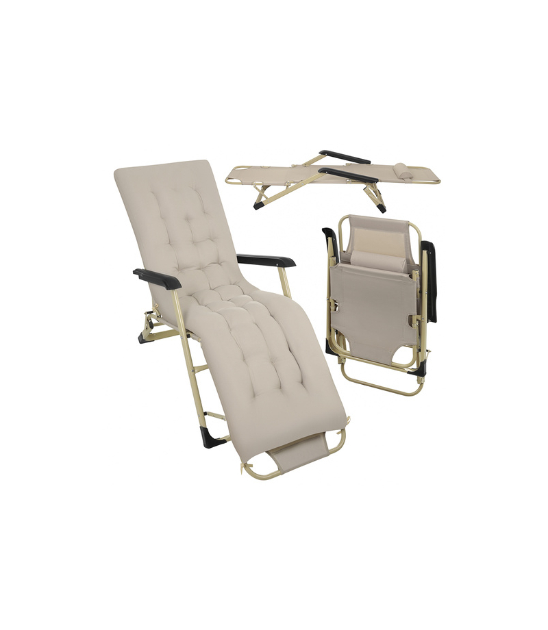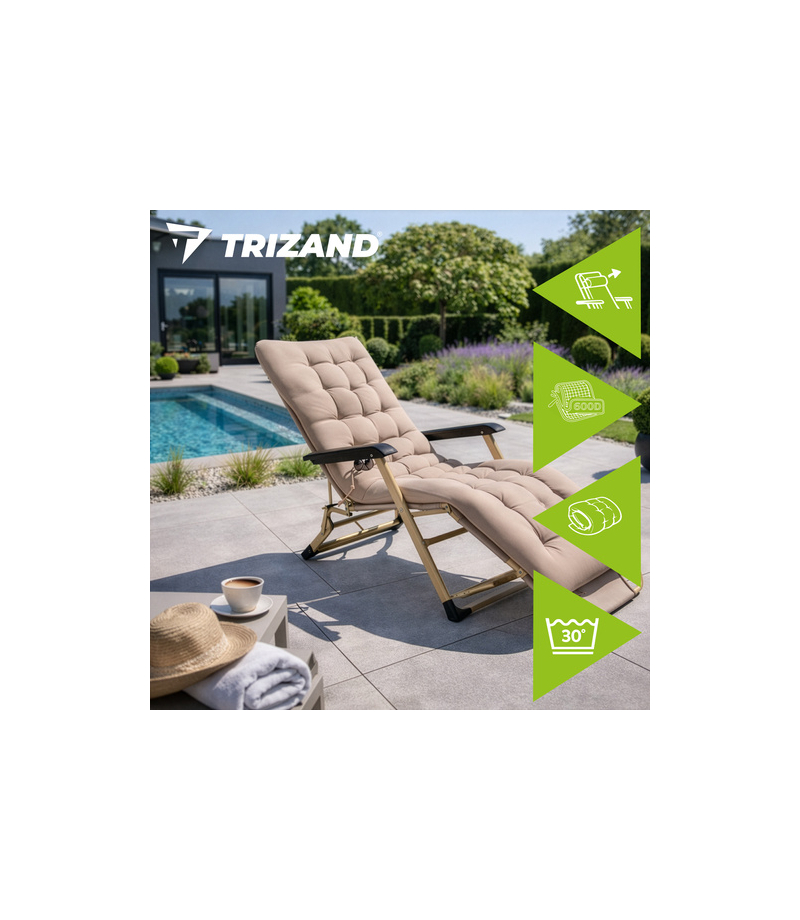 Chcesz wygodnie odpocząć w ogrodzie, na tarasie albo na plaży - bez kombinowania z ciężkimi meblami i niewygodnymi leżankami Składany leżak TRIZAND 3w1 daje Ci komfortową pozycję siedzącą, półleżącą lub leżącą, a do tego ma grubą poduszkę i zagłówek w zestawie .