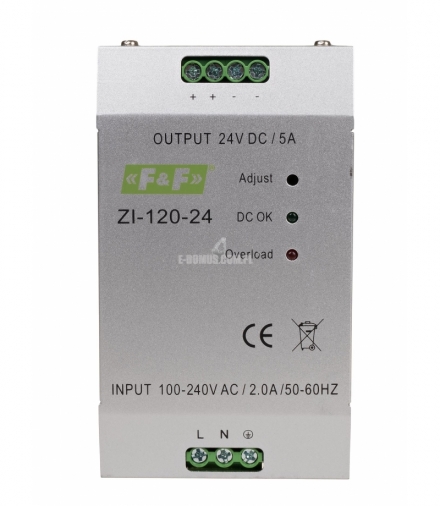 Zasilacz impulsowy. Napięcie wyjściowe 24 V. Moc 120 W. Do układów zasilania urządzeń elektrycznych i elektronicznych w systemach automatyki przemysłowej oraz sieciach informatycznych. Więcej szczegółów