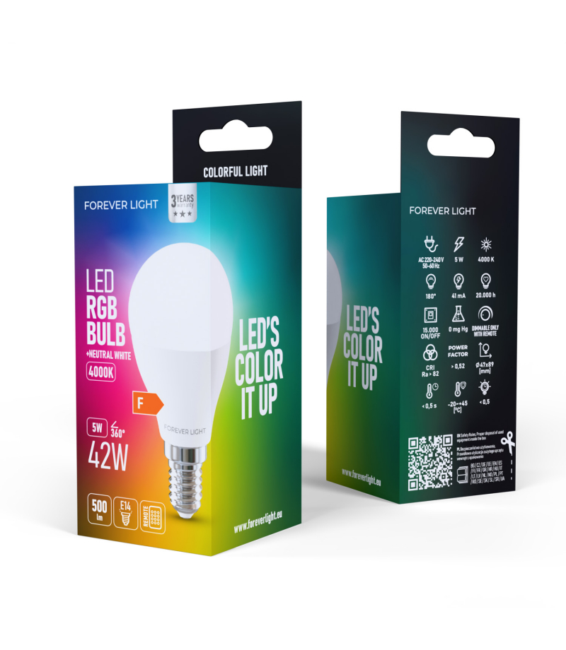 Forever Light Żarówka LED RGB E14 G45 5W 500lm 4000K klasa F TFO RTV9000080 Żarówki LED Forever Light RGB to nowoczesne źródła światła, które łączą klasyczne oświetlenie z możliwością tworzenia efektów kolorystycznych. W ofercie dostępne są różne modele: E14 C37 5W – 500 lm, E14 G45 5W – 500 lm, E27 A60 8W – 850 lm oraz GU10 4.8W – 440 lm. Dzięki temu klienci mogą wybrać odpowiednią żarówkę do każdego typu lampy i pomieszczenia. Żarówki świecą...