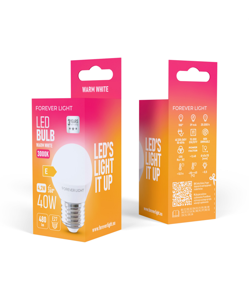 Żarówki Forever Light wyróżniają się standardowym gwintem E27, dzięki czemu są kompatybilne z większością opraw dostępnych na rynku. Klasa energetyczna E gwarantuje niższe zużycie prądu w porównaniu z tradycyjnymi źródłami światła, a wysoka trwałość sprawia, że nie wymagają częstej wymiany. To praktyczne i ekonomiczne rozwiązanie dla klientów indywidualnych i biznesowych.