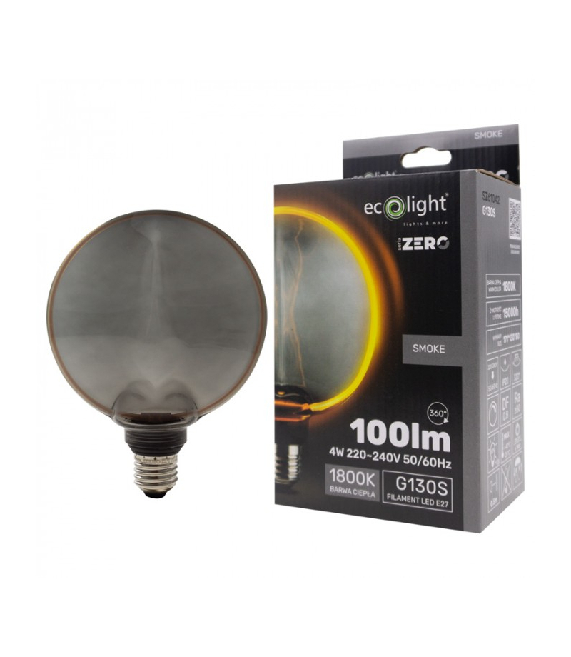 SERIA ZERO 4W 100lm E27 G130 Smoke Eco Light SZ61042 Żarówka LED SERIA ZERO 4W 100lm E27 G130 Smoke to stylowe i funkcjonalne rozwiązanie do oświetlenia wnętrz, które łączy nowoczesny wygląd z wysoką jakością światła. Dzięki kloszowi z dymionego szkła żarówka nadaje przestrzeni elegancki i subtelny charakter, emitując bardzo ciepłe białe światło. Świetnie sprawdzi się jako element dekoracyjny w salonach, sypialniach, restauracjach czy kawiarniach, tworząc przytulną atmosferę....