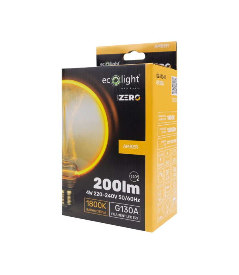 SERIA ZERO 4W 200lm E27 G130 Amber Eco Light SZ61041 Żarówka LED SERIA ZERO 4W 200lm E27 G130 Amber to wyjątkowe oświetlenie dekoracyjne, które łączy klasyczny wygląd z nowoczesną technologią LED. Wyposażona w klosz z bursztynowego szkła, wprowadza ciepły i przytulny nastrój do każdego wnętrza, emitując bardzo ciepłe białe światło o strumieniu świetlnym 200 lumenów. Doskonała do tworzenia nastrojowej atmosfery w miejscach takich jak salon, sypialnia, restauracja czy kawiarnia....