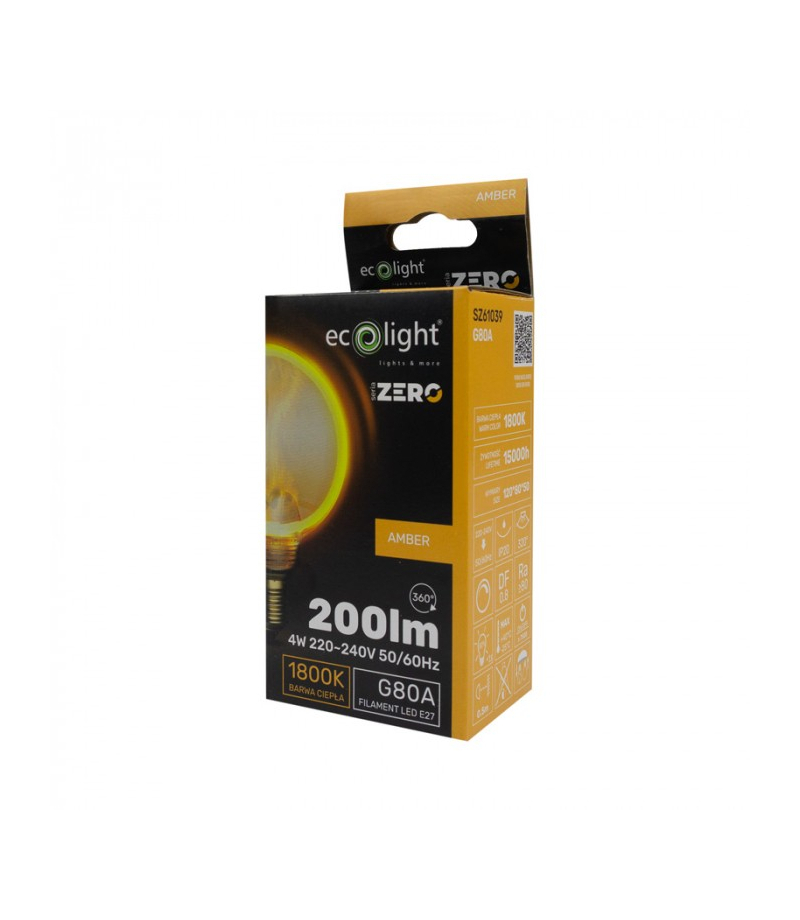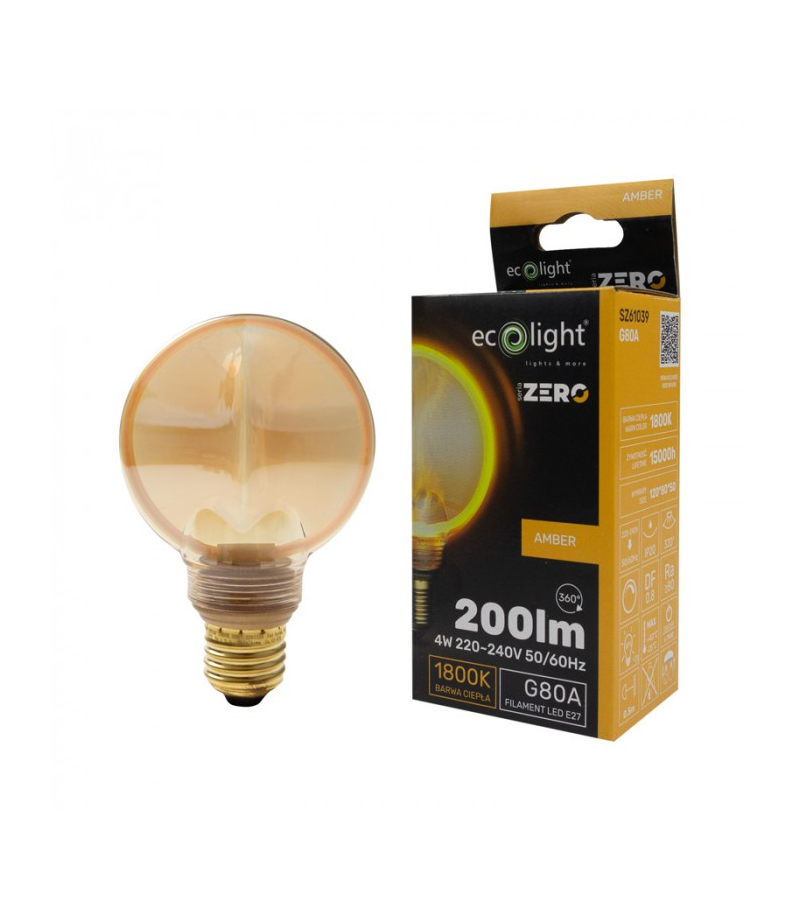 SERIA ZERO 4W 200lm E27 G80 Amber Eco Light SZ61039 Żarówka LED SERIA ZERO 4W 200lm E27 G0 Amber to eleganckie rozwiązanie oświetleniowe, które łączy nowoczesną technologię z klasycznym stylem. Wyposażona w klosz ze szkła bursztynowego, emituje bardzo ciepłe przytulne światło. Idealna do dekoracyjnego oświetlenia w pomieszczeniach takich jak salony, sypialnie, restauracje i kawiarnie. Wysokość: 189 Szerokość: 100...