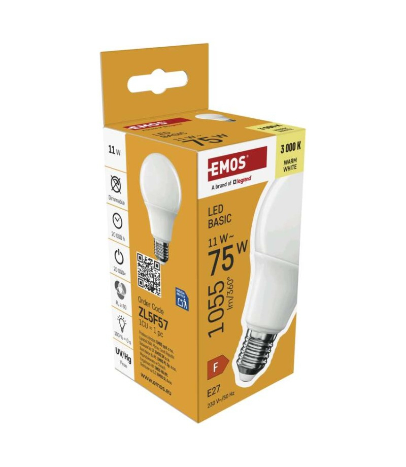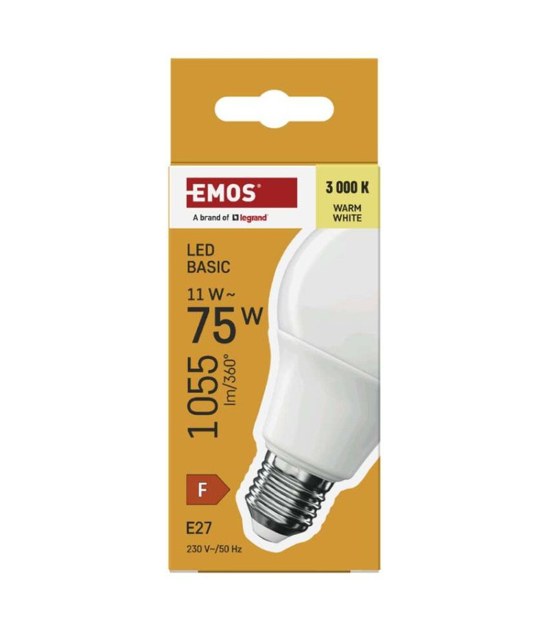 Żarówka LED Basic A60 E27 11W (75 W) 1055 lm ciepła biel EMOS ZL5F57 Barwa światła: ciepła biel Chip LED: SMD Ilość cykli włącz\wyłącz: 20 000 Ilość LED: nie dotyczy Indeks oddawania barw (CRI): Ra >80 Kąt świecenia: 200° Klasa energetyczna: F Kształt: A60...