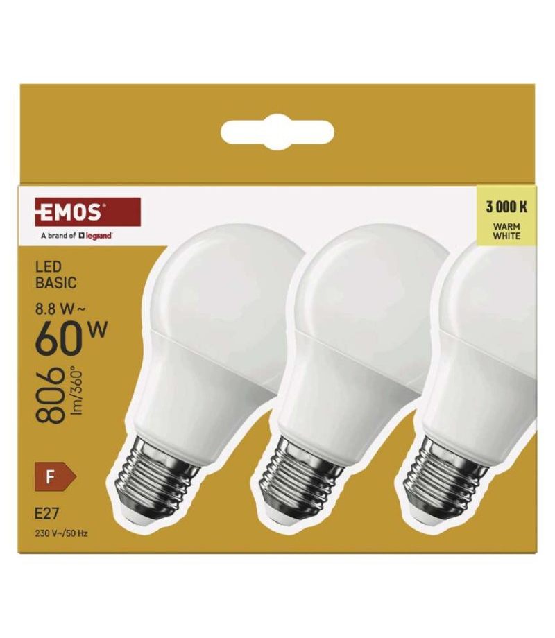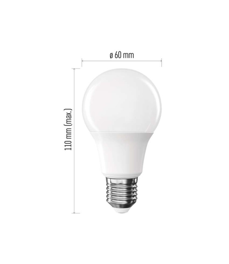Żarówka LED Basic A60 E27 8,8 W (60 W) 806 lm ciepła biel EMOS ZL5F47.3 Barwa światła: ciepła biel Chip LED: SMD Ilość cykli włącz\wyłącz: 20 000 Ilość LED: nie dotyczy Indeks oddawania barw (CRI): Ra >80 Kąt świecenia: 200° Klasa energetyczna: F Kształt: A60...