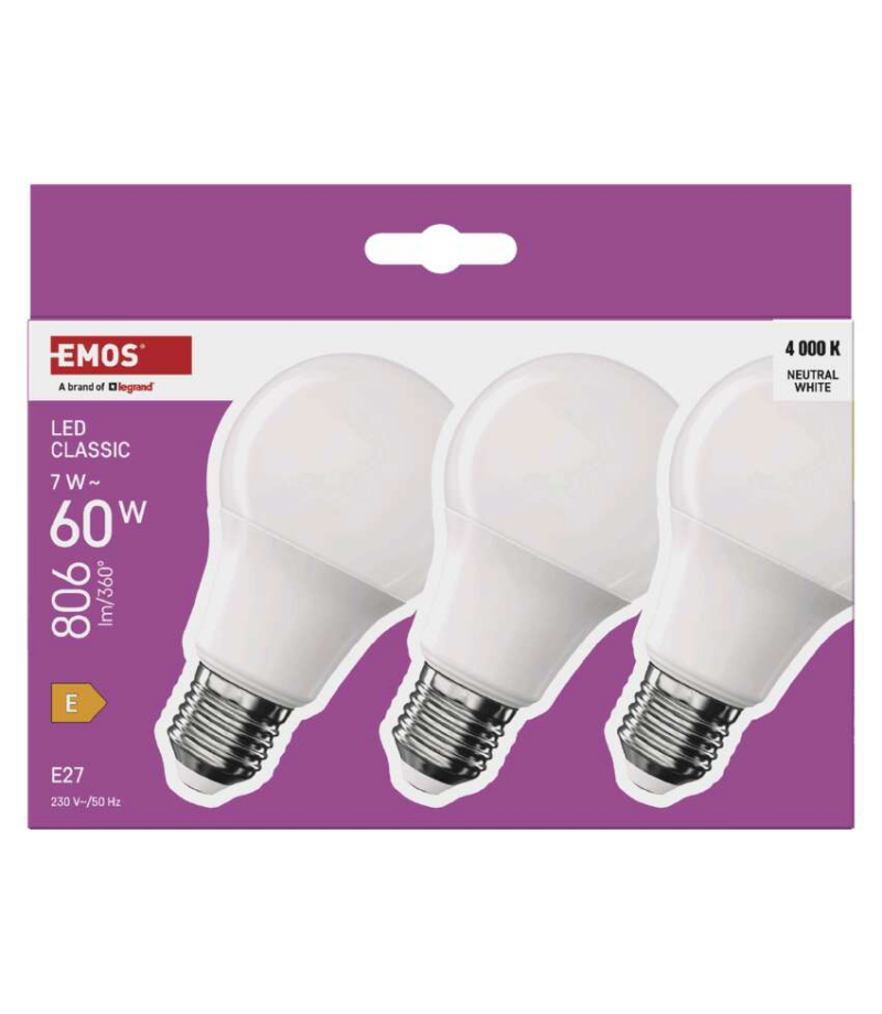 Żarówka LED Classic A60 E27 7 W (60 W) 806 lm neutralna biel EMOS ZQ5E43.3 Barwa światła: neutralna biel Chip LED: SMD Ilość cykli włącz\wyłącz: 30 000 Ilość LED: nie dotyczy Indeks oddawania barw (CRI): Ra >80 Kąt świecenia: 180° Klasa energetyczna: E Kształt:...