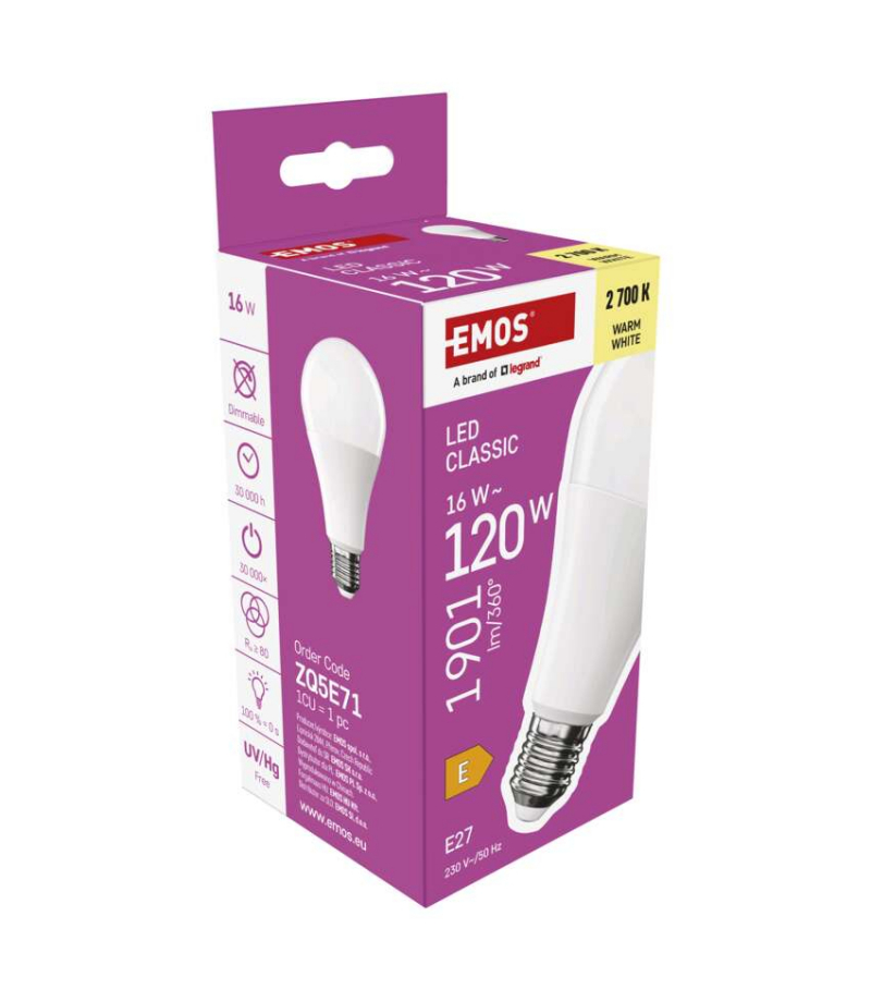 Żarówka LED Classic A70 E27 16 W (120 W) 1901 lm 1901 lm ciepła biel EMOS ZQ5E71 Barwa światła: ciepła biel Chip LED: SMD Ilość cykli włącz\wyłącz: 30 000 Ilość LED: nie dotyczy Indeks oddawania barw (CRI): Ra >80 Kąt świecenia: 180° Klasa energetyczna: E Kształt:...