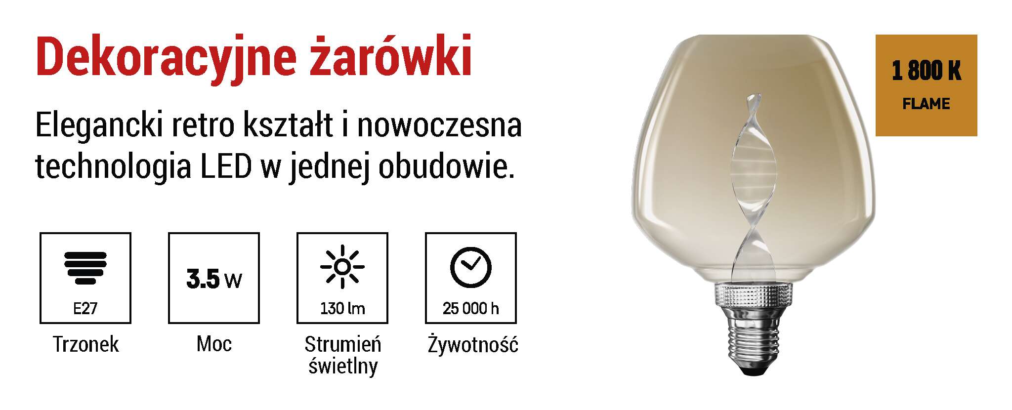 Żarówka LED DECO S123, E27, 3.5W, 130lm, flame, (odpowiednik 14W) EMOS Z59D01 Wygląd w stylu vintage i ciepłe światło dla wyjątkowej atmosfery Odkryj magię ciepłego światła dzięki naszym stylowym żarówkom LED, które łączą nowoczesną oszczędność energii z klasycznym wzornictwem. Dzięki temperaturze barwowej 1800 K tworzą one ciepłą i przytulną atmosferę, idealną do domu i pomieszczeń komercyjnych. > Złote...