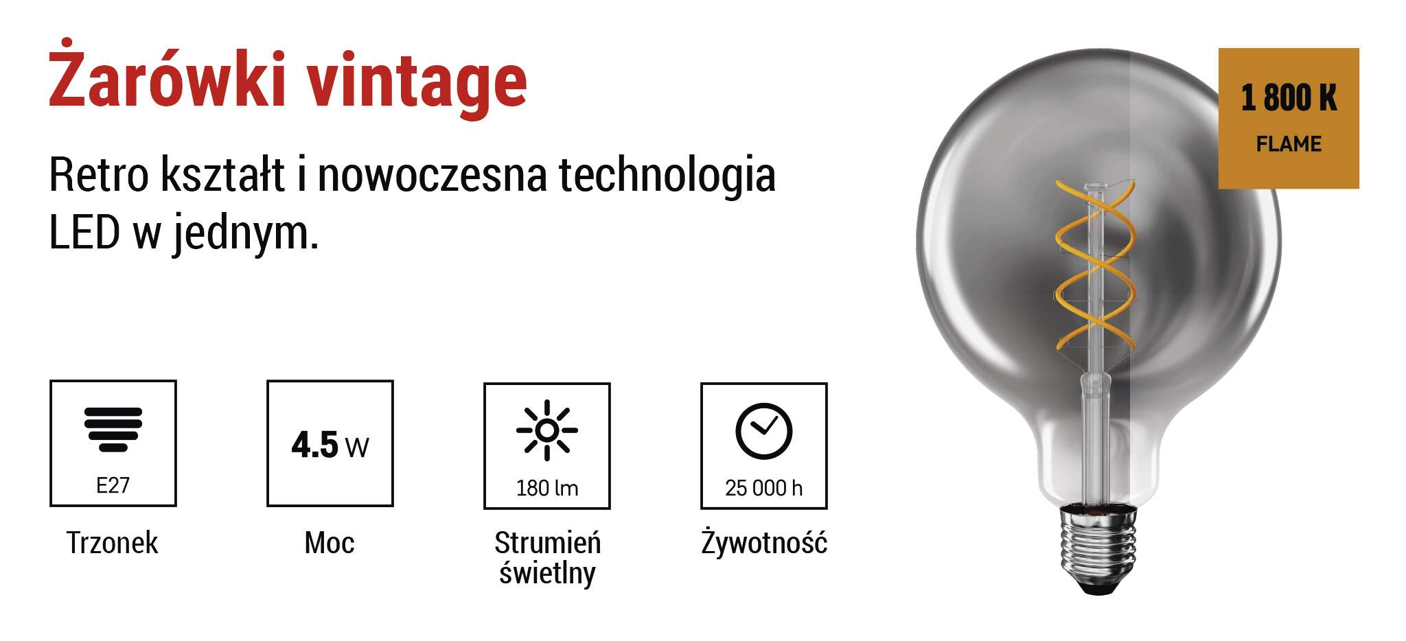 Żarówka LED DECO SMOKED G125 E27 4,5 W (19 W) 180 lm flame EMOS Z58311 Wygląd w stylu vintage i ciepłe światło dla wyjątkowej atmosfery Odkryj magię ciepłego światła dzięki naszym stylowym żarówkom LED, które łączą nowoczesną oszczędność energii z klasycznym wzornictwem. Dzięki temperaturze barwowej 1 800 K, tworzą one ciepłą i przytulną atmosferę, idealną do domu i pomieszczeń komercyjnych....