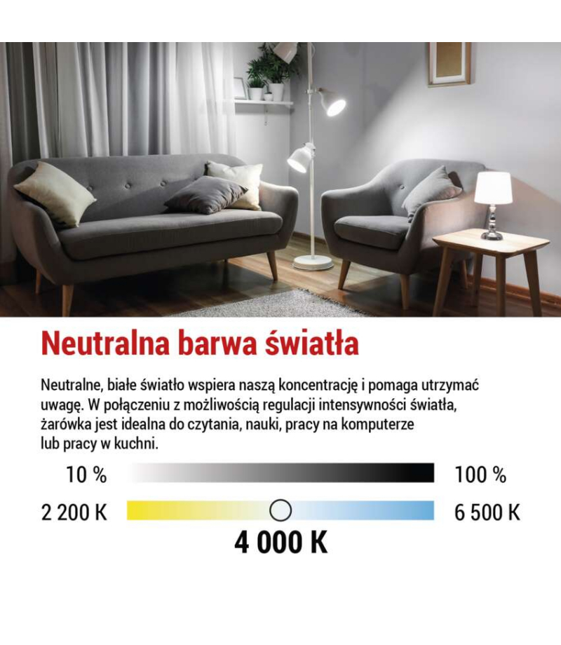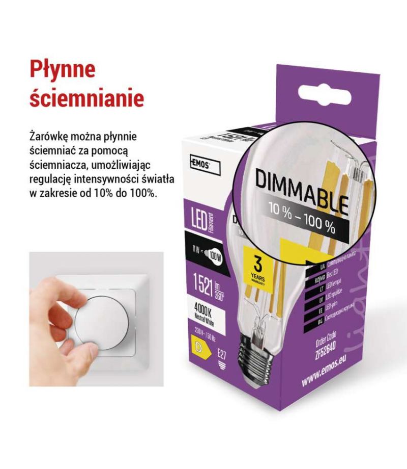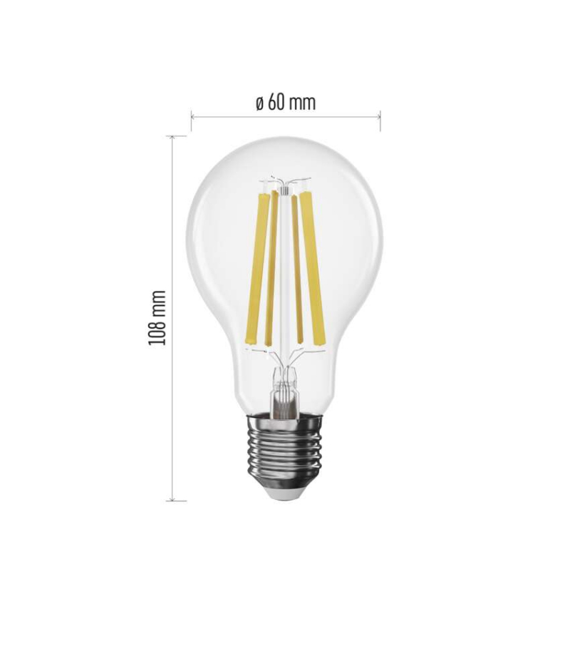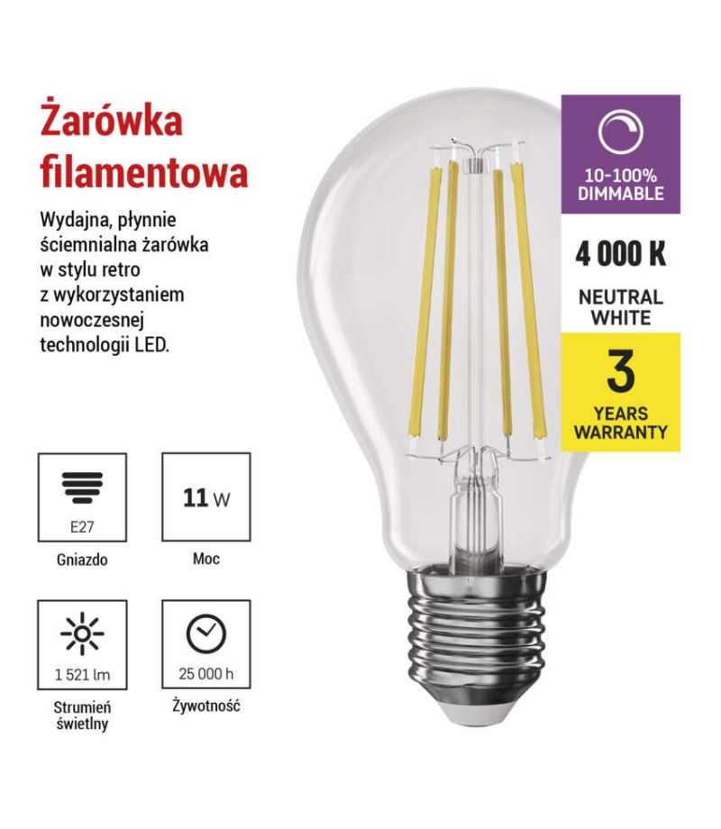 Żarówka LED Filament A60 E27 11W (100W) 1521 lm neutralna biel ściemnialna EMOS ZF5264D Barwa światła: neutralna biel Chip LED: COB Ilość cykli włącz\wyłącz: 25 000 Ilość LED: nie dotyczy Indeks oddawania barw (CRI): Ra >80 Kąt świecenia: 320° Klasa energetyczna: D...