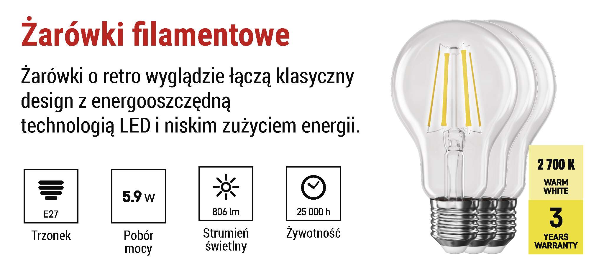 Żarówki LED marki Filament zapewniają wysoką wydajność świetlną, długą żywotność i niskie zużycie energii . Ich klasyczny kształt i standardowe gniazdo sprawiają, że są łatwe w montażu , a natychmiastowe świecenie z pełną mocą zapewnia komfort w codziennym użytkowaniu.