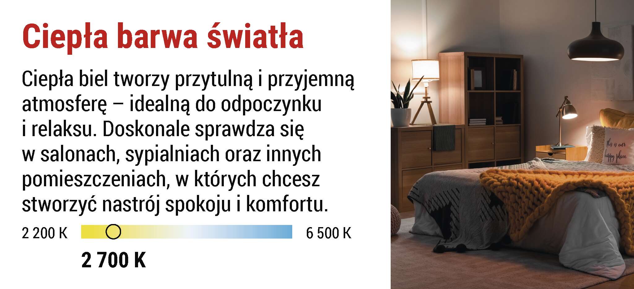 Ciepłe światło tworzy odpowiednią atmosferę dla chwil spokoju, relaksu i domowego komfortu . Jest miękkie, przytulne i naturalnie przemawia do zmysłów - idealne na wieczory z książką, rodzinne obiady i relaks po męczącym dniu. Zmienia każdą przestrzeń w miejsce, w którym czujesz się naprawdę jak w domu. Dodaje ciepłego akcentu , podkreśla kolory i wyczarowuje przyjemny nastrój , który nigdy Ci się nie znudzi.