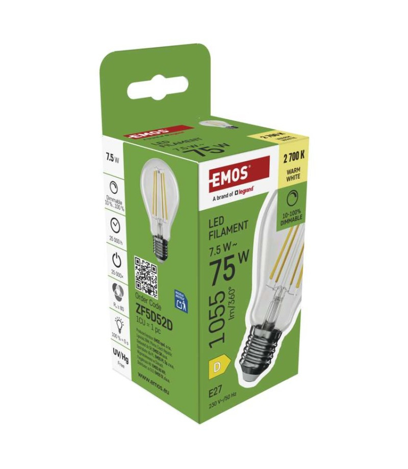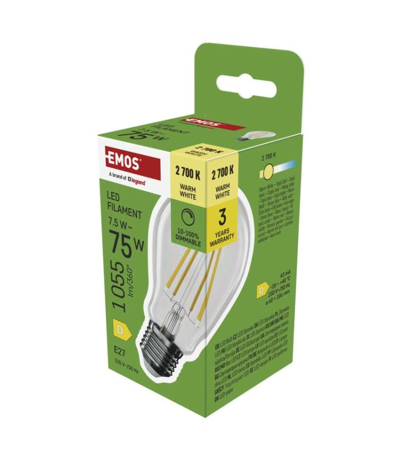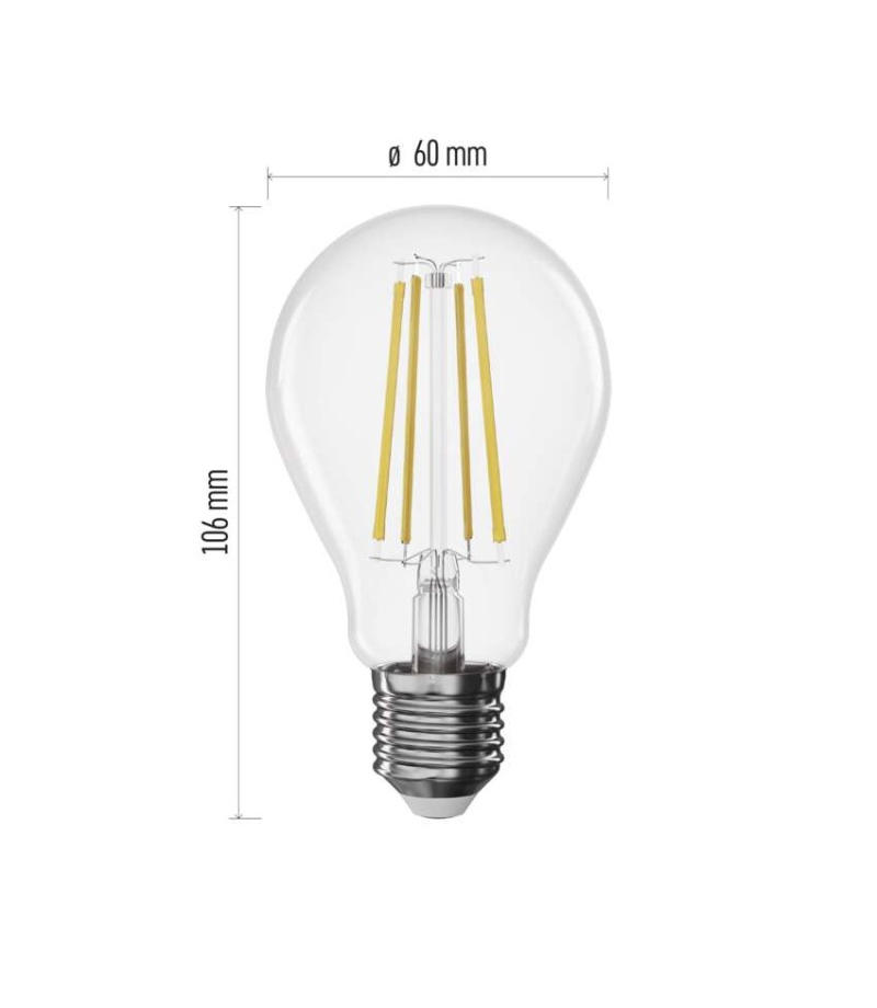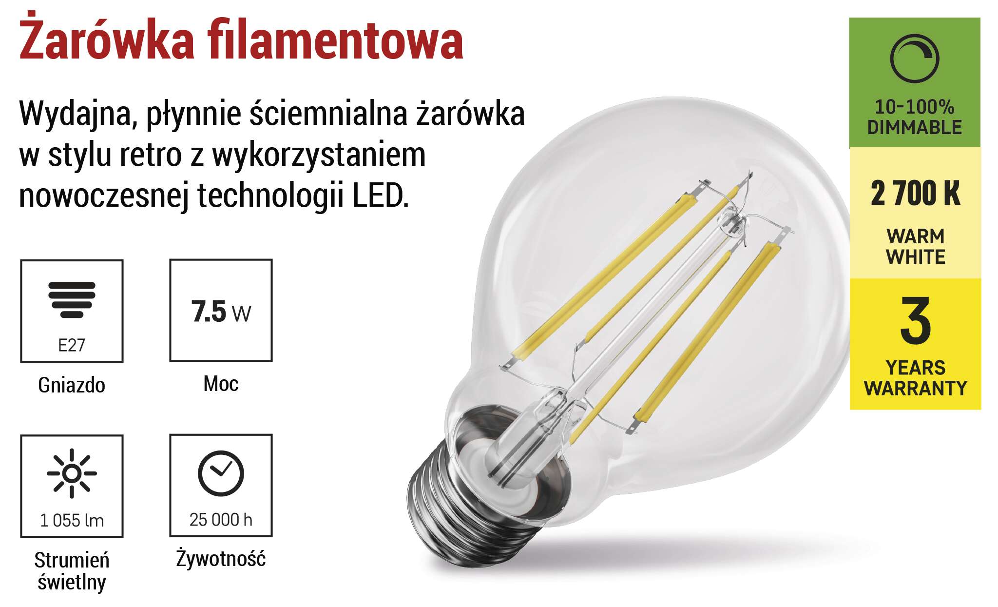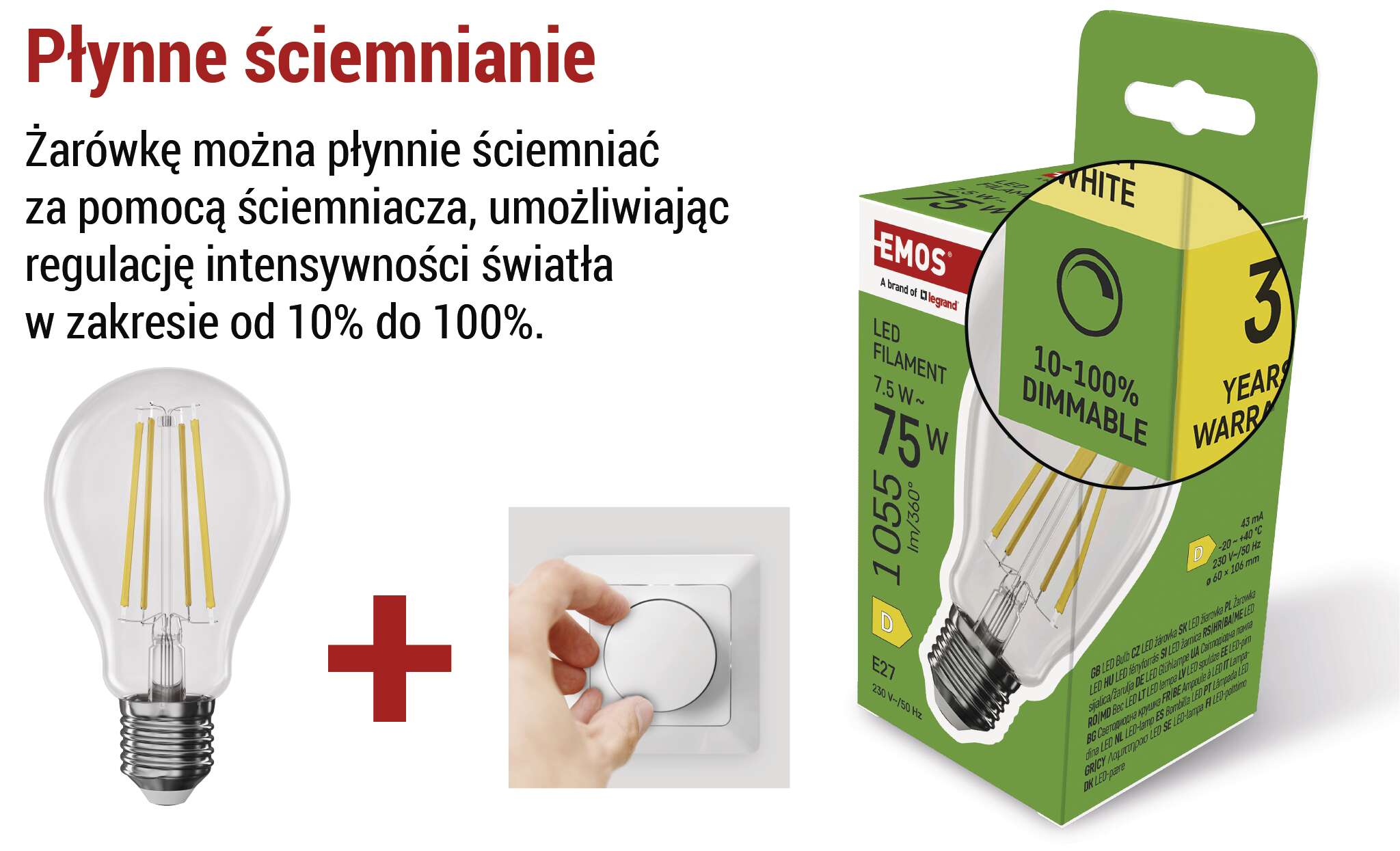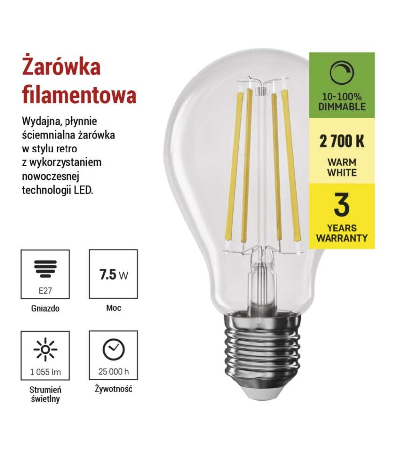 Żarówka LED Filament A60 E27 7,5 W (75 W) 1 055 lm ciepła biel ściemnialna EMOS ZF5D52D Mocne i oszczędne oświetlenie Ta żarówka LED w kształcie klasycznej żarówki A60 to idealny wybór dla każdego, kto szuka mocnego, ale oszczędnego oświetlenia . Przy poborze mocy wynoszącym zaledwie 7,5 W , zapewnia strumień świetlny do 1 055 lumenów , co jest odpowiednikiem klasycznej żarówki 75 W. Wyjątkowo wysoka skuteczność świetlna wynosząca 141 lm/W...