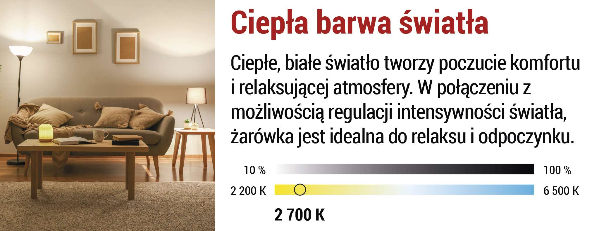 Światło o temperaturze 2700 K emituje ciepłą białą barwę, która wywołuje uczucie komfortu i spokoju . Idealne do salonów, sypialni lub innych przestrzeni , w których potrzebne jest ciepłe i przytulne oświetlenie z ciepłym akcentem.
