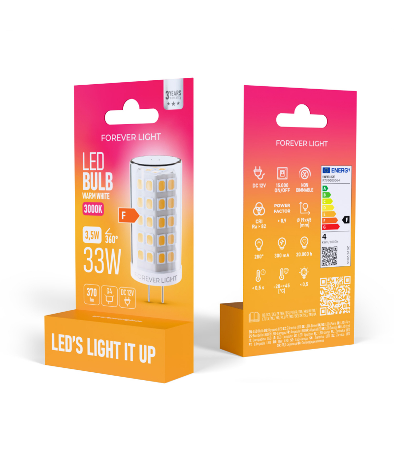 Żarówki Forever Light G4 3.5W to idealne rozwiązanie dla klientów szukających małych, energooszczędnych i estetycznych źródeł światła. Doskonale podkreślają detale wnętrza, nadając mu wyjątkowego charakteru. To wybór łączący funkcjonalność, trwałość i elegancję w kompaktowej formie.