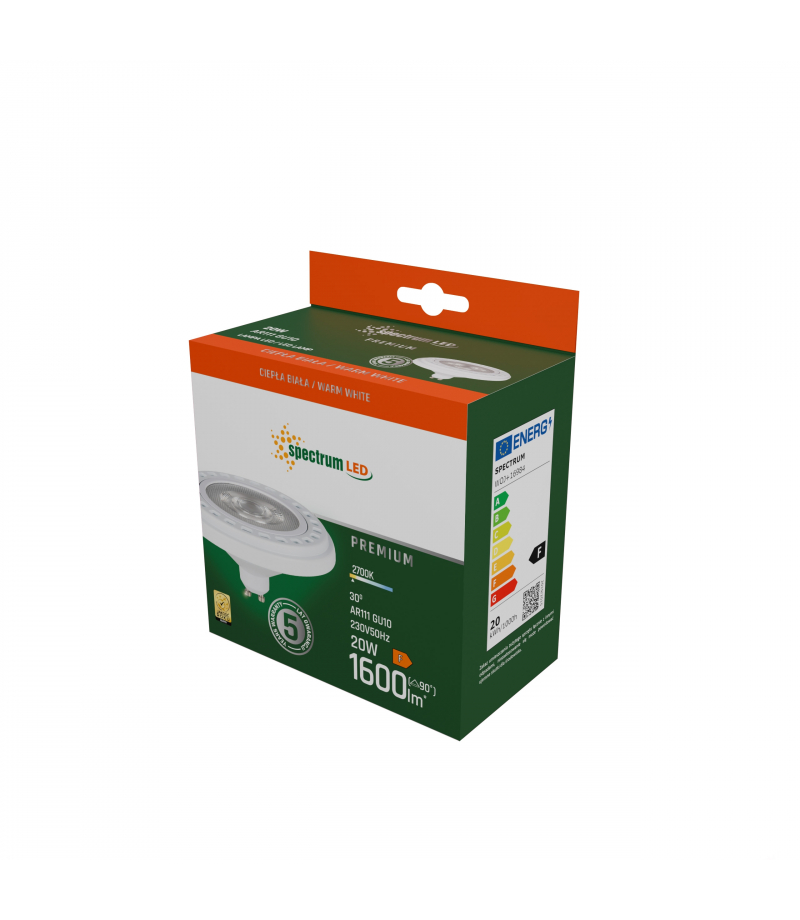 Źródło LED AR111 GU10 20 W z popularnym mocowaniem na GU10. Wykonane jest z komponentów o wysokiej jakości, potwierdzonej 5 letnią gwarancją. Wyróżnia się także bardzo wysokim wskaźnikiem oddawania barw RA>90. Wąski kąt świecenia 30° daje kierunkowe światło, dzięki czemu można lepiej wyeksponować wybrane przedmioty lub powierzchnie.