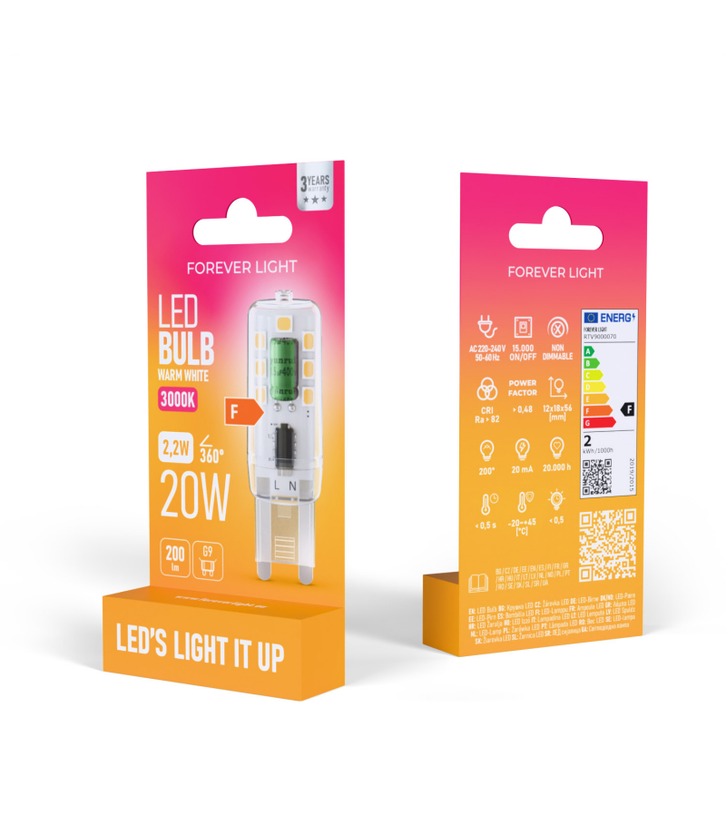 Żarówki LED Forever Light G9 to kompaktowe i praktyczne źródła światła, które idealnie sprawdzają się w nowoczesnych lampach i oprawach dekoracyjnych. Model o mocy 2.2W generuje strumień świetlny 200 lm, co zapewnia jasne, równomierne oświetlenie przy niskim zużyciu energii. Dzięki niewielkim wymiarom świetnie pasuje do lamp o ograniczonej przestrzeni montażowej.