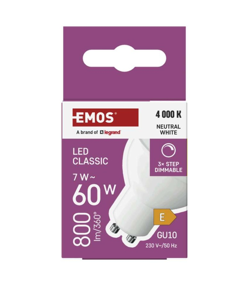 Żarówka LED ściemnialna GU10, 7W, 800lm, neutralna biel 4000K, (odpowiednik 60W), Classic MR16, EMOS ZQ8E44S Barwa światła: neutralna biel Chip LED: SMD Częstotliwość: nie dotyczy Ilość cykli włączwyłącz: 25 000 Ilość LED: nie dotyczy Indeks oddawania barw (CRI): Ra >80 Kąt świecenia: 100° Klasa energetyczna: E Kompatybilność: nie dotyczy Kształt: MR16 Moc: 7 W Napięcie: 230 V~/50 Hz Obsługiwany...
