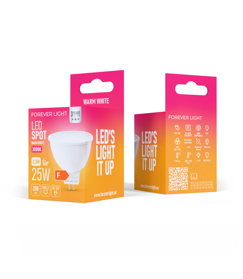 Forever Light Żarówka LED GU5,3 MR16 2.5W 250lm 3000K 12V klasa F TFO RTV9000058 Żarówki LED Forever Light GU5.3 MR16 12V to wydajne i kompaktowe źródła światła, które sprawdzają się zarówno w oświetleniu domowym, jak i komercyjnym. Dostępne są modele o mocy 2.5W – 250 lm oraz 4.2W – 400 lm, dzięki czemu można dobrać intensywność oświetlenia do indywidualnych potrzeb. To rozwiązanie idealne do lamp wpuszczanych, oczek sufitowych czy systemów oświetleniowych na 12V....