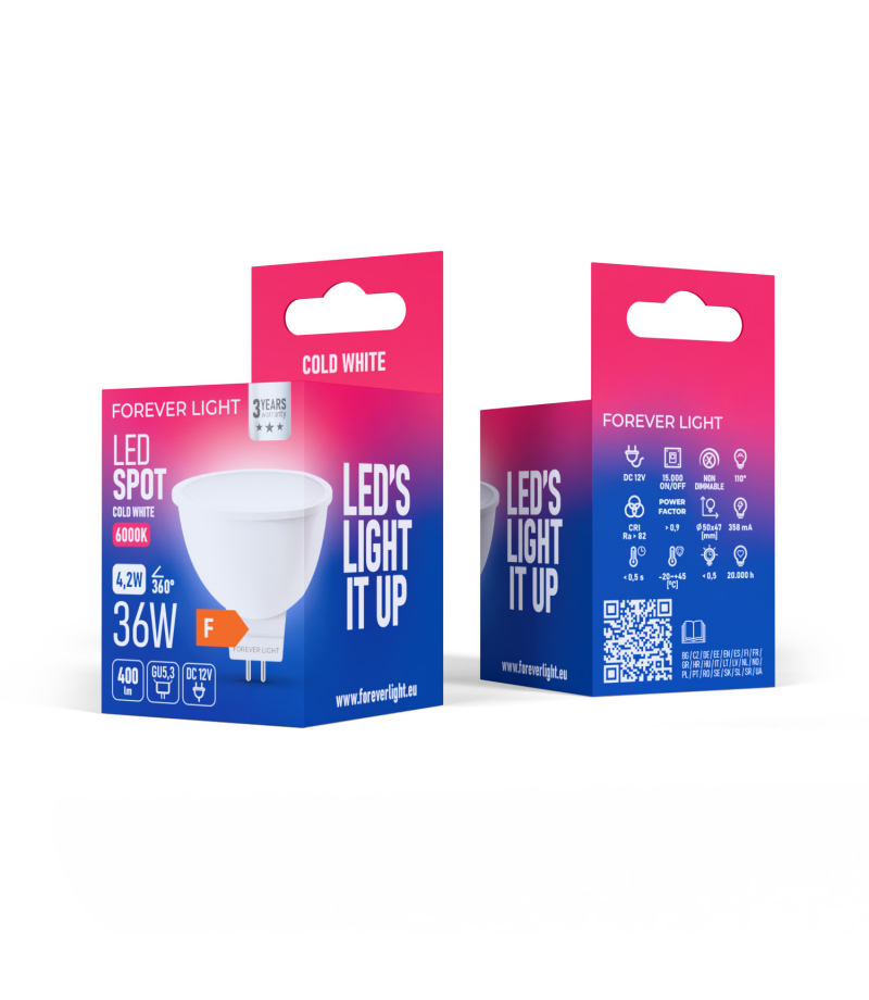 Żarówki LED Forever Light GU5.3 MR16 12V to wydajne i kompaktowe źródła światła, które sprawdzają się zarówno w oświetleniu domowym, jak i komercyjnym. Dostępne są modele o mocy 2.5W – 250 lm oraz 4.2W – 400 lm, dzięki czemu można dobrać intensywność oświetlenia do indywidualnych potrzeb. To rozwiązanie idealne do lamp wpuszczanych, oczek sufitowych czy systemów oświetleniowych na 12V.